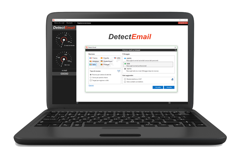 Il nostro software, grazie all'IA, esplora il web velocemente per raccogliere indirizzi email e numeri di telefono mirati, perfetti per le tue esigenze!